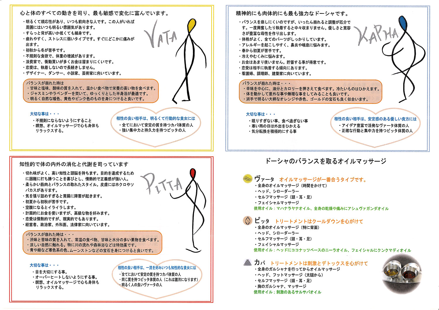 アーユルヴェーダに基づいてインド、スリランカで行われているリートメントをご提供致します。お客様にお尋ねした質問表から現在のドーシャ(体質傾向)に合わせてトリートメントのプランをご提供致します。